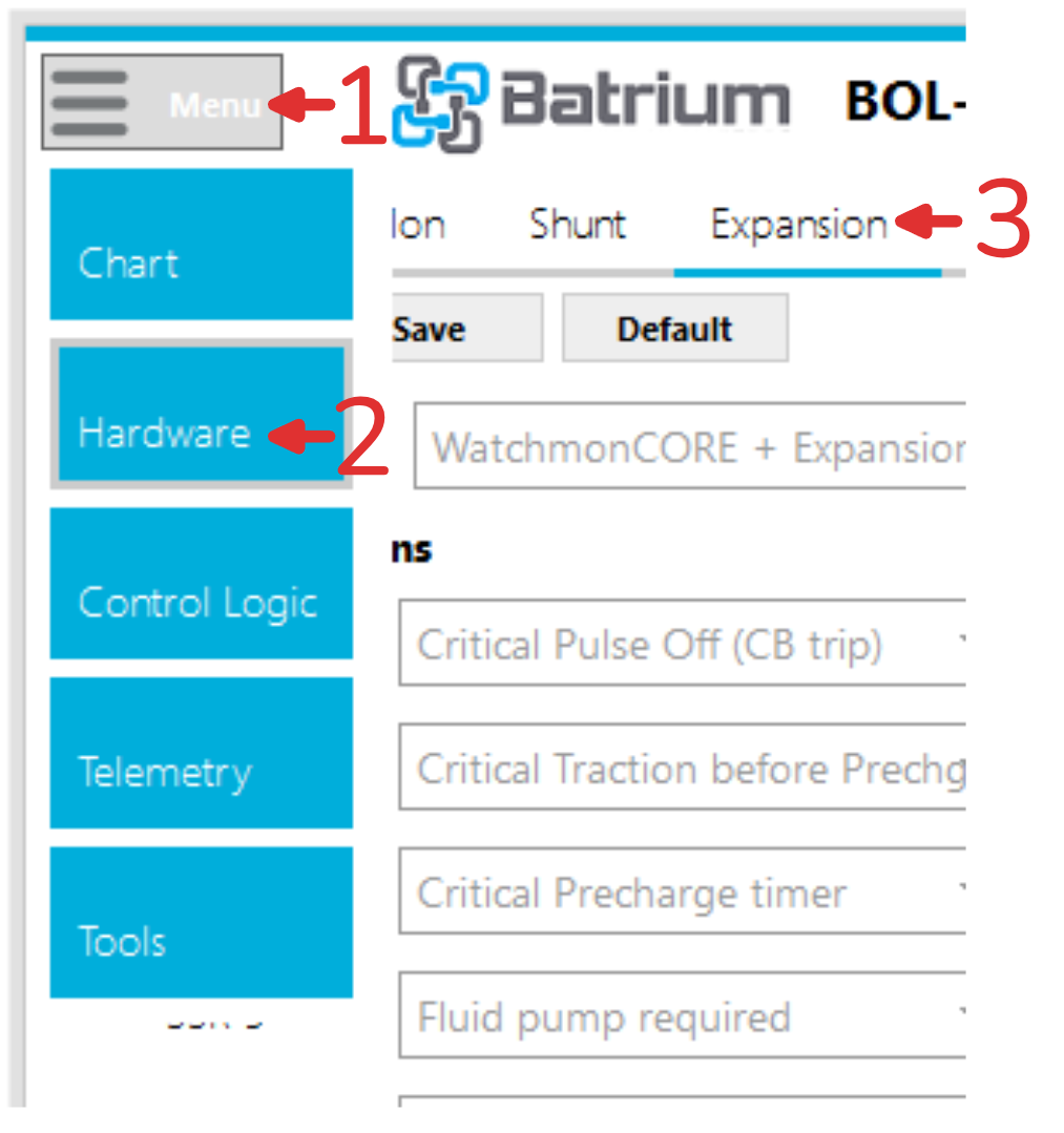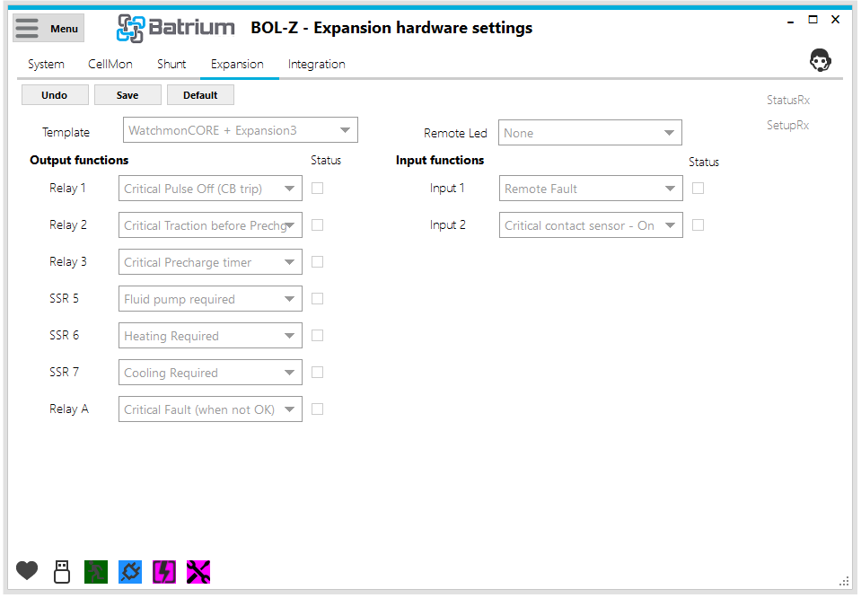 This screen allows you to manage the Expansion Board hardware functions. This is where the inputs and outputs are defined to interface with external equipment like relays, pack heating and cooling, circuit breakers, contactors, or any other external equipment you wish to interface in a simple way with Batrium equipment.