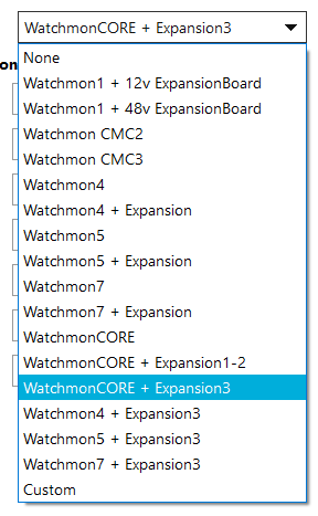 These fields can be set individually to activate when the prerequisite condition is met in the BMS. For our most common hardware combination, a WatchMonCORE and Expansion Board 3, you will have access to relay A on the WatchMon, as well as Relays 1-3 and SSRs 5-7 on the Expansion board.