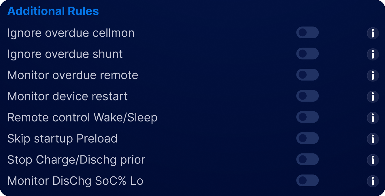 | LF2 | Ignore Overdue Shunt | If enabled, overdue (timed out communication) Shunts will not trigger a critical event, only real out-of-range readings |