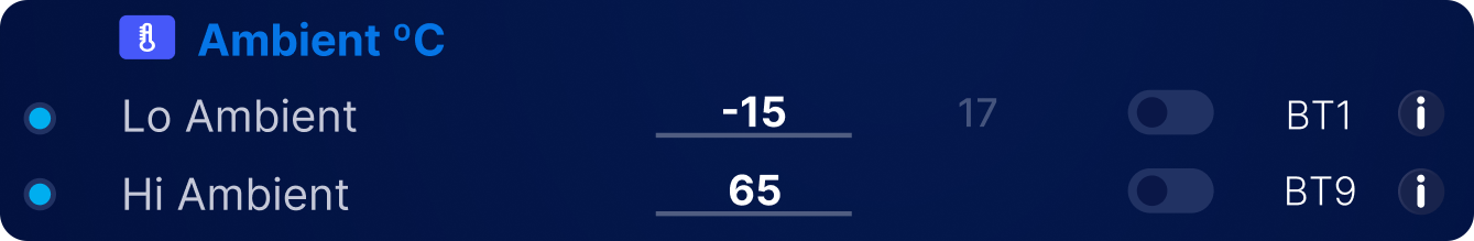 | BT9 | Hi Ambient(BT9) | If the ambient temperature sensor on the WatchMon goes below this temperature,and this value is set to be monitored (Monitor switch ON), the BMS starts transitioning to a critical state |