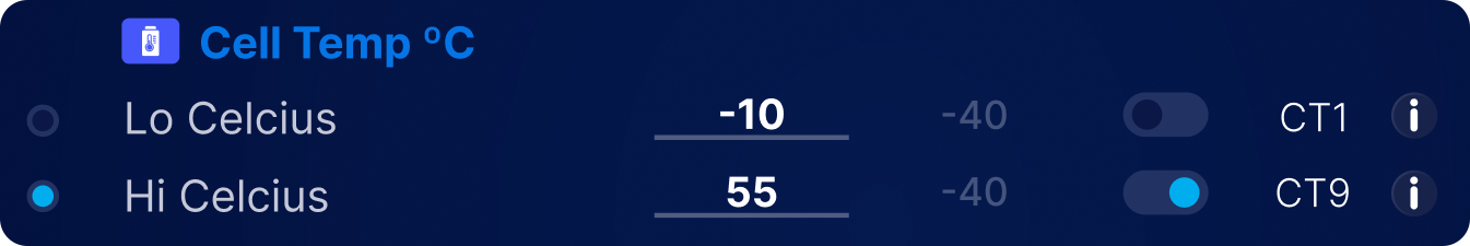 | CT1 | Lo Cell | If a cell goes below this temperature, and this value is set to be monitored (Monitor switch ON), the BMS starts transitioning to a critical state |