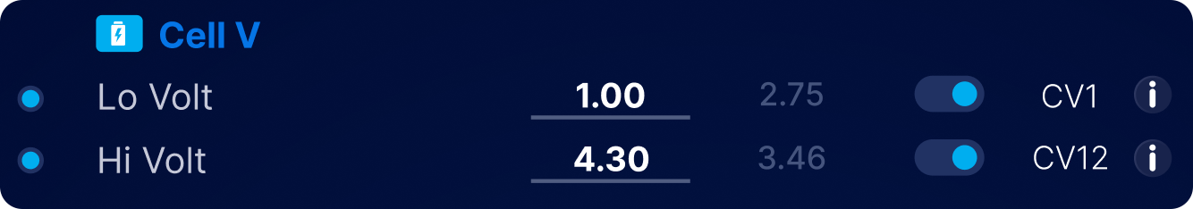 | CV1 | Lo Volt | If a cell goes below this voltage, and this value is set to be monitored (Monitor switch ON), the BMS starts transitioning to a critical state |