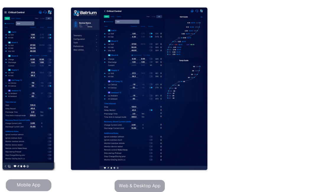 | QV1 | Lo Volt | If the total shunt voltage goes below this threshold, and this value is set to be monitored (Monitor switch ON), the BMS starts transitioning to a critical state |