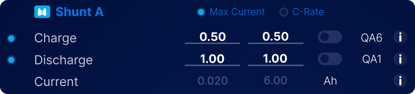 | QA6 | Charge Max Cutout | If the charge current passing through the shunt exceeds this value, and this value is set to be monitored (Monitor switch ON), the BMS will start transitioning to a critical state |