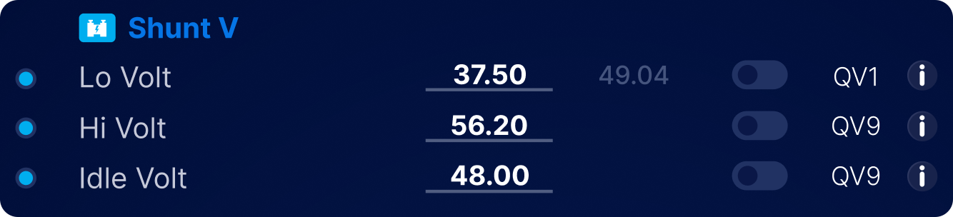 | QV6 | Idle Shunt Volt | If the total system voltage goes below this threshold, and the shunt is in an idle state (below its idle current threshold), then the BMS starts transitioning to a critical state. Typically stricter than the base low voltage threshold, as the base threshold must allow for voltage sag under load |