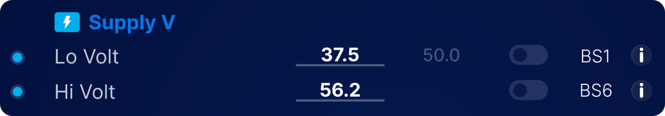 | BS1 | Lo Volt | If the supply voltage of the WatchMon goes below this voltage, and this value is set to be monitored (Monitor switch ON), then the BMS starts transitioning to a critical state This can be used in place of a shunt voltage in low voltage systems, but we don't recommend it |