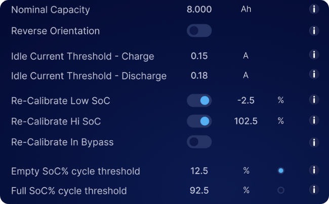 | Re-Calibrate in Bypass (QF2) | When all cells have balanced according to their rules, this will reset the SoC% to 100% capacity |