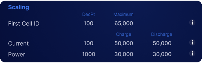 | Idle Current Threshold - Charge (QA11) | Below this charge current, the battery is considered in a idle state, rather than charging. Used by the BMS to detect when the battery is at rest and have different logic. |